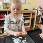 Zimowa sensoplastyka — małe dłonie-duża wyobraźnia — ciepły śnieg i lód w grupie Pszczółki