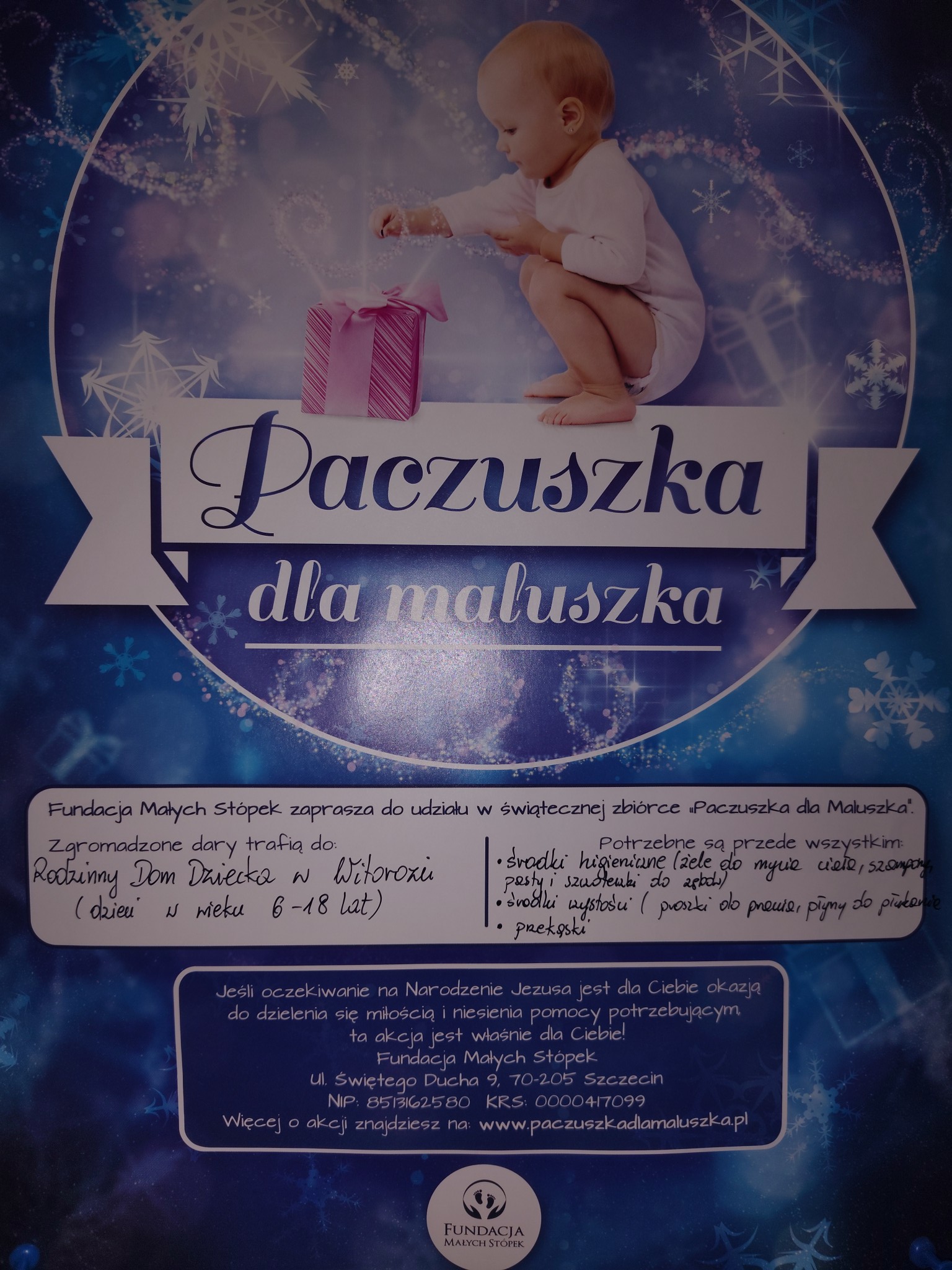 Udział w akcji charytatywnej Paczuszka dla Maluszka organizowanej przez Fundację Małych Stópek – tworzymy paczkę dla Rodzinnego Domu Dziecka w Witorożu