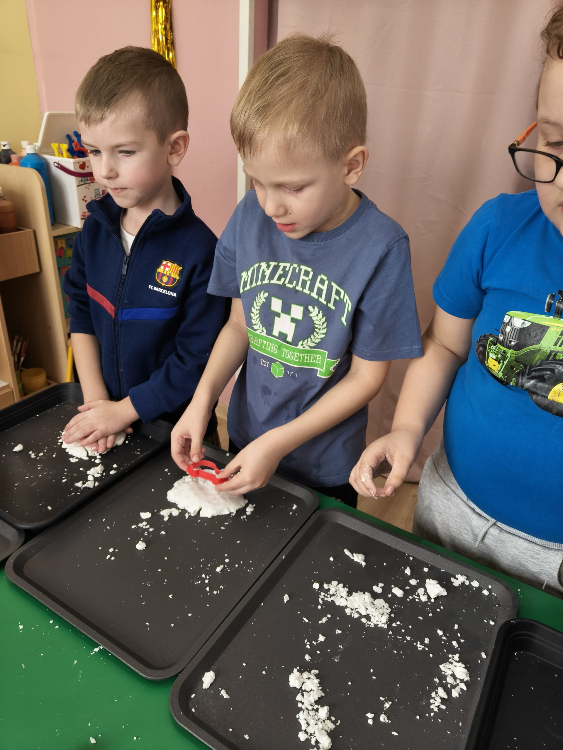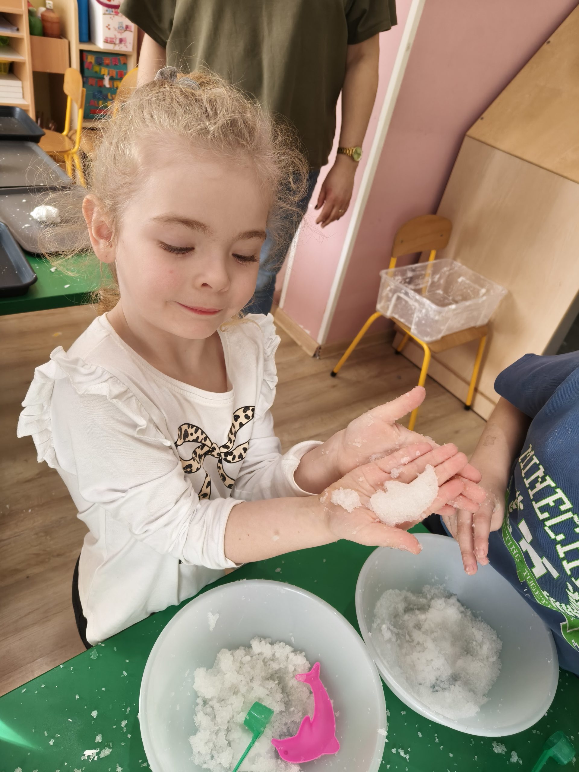 Zimowa sensoplastyka — małe dłonie-duża wyobraźnia — ciepły śnieg i lód w grupie Pszczółki
